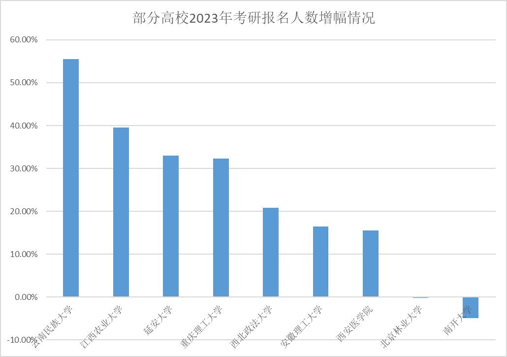 在今年的報(bào)考中,部分“雙一流”大學(xué)報(bào)考人數(shù)增長(zhǎng)水平明顯低于“雙非”院校,南開大學(xué)、北京林業(yè)大學(xué)甚至出現(xiàn)負(fù)增長(zhǎng)。而“雙非”院校的報(bào)考增長(zhǎng)率普遍較高,云南民族大學(xué)、江西農(nóng)業(yè)大學(xué)、延安大學(xué)、重慶理工大學(xué)等增長(zhǎng)率均超過(guò)了30%。