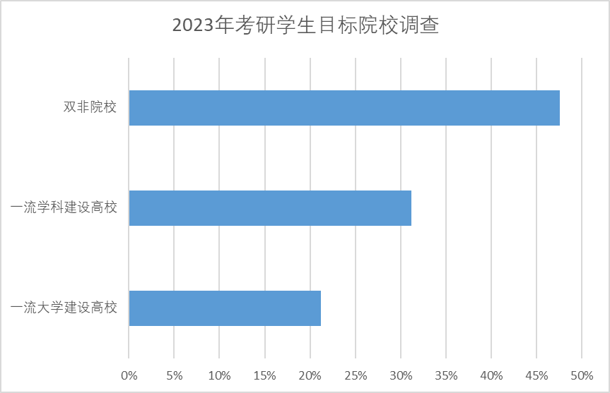 同樣,根據(jù)中國(guó)教育在線開展的2023年考研學(xué)生目標(biāo)院校問(wèn)卷調(diào)查顯示,今年參加考研的考生中,有近五成的考生目標(biāo)院校為雙非院校;其次是一流學(xué)科建設(shè)高校,占比超過(guò)三成;最后是一流大學(xué)建設(shè)高校占比兩成多。