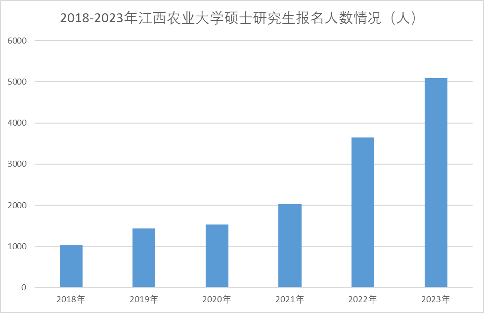 近幾年,江西農(nóng)業(yè)大學(xué)碩士研究生報(bào)考人數(shù)增長(zhǎng)迅猛,報(bào)考人數(shù)從2018年的1029人增長(zhǎng)至2023年的5087人,年均增長(zhǎng)近65%。
