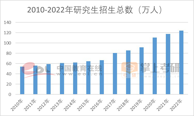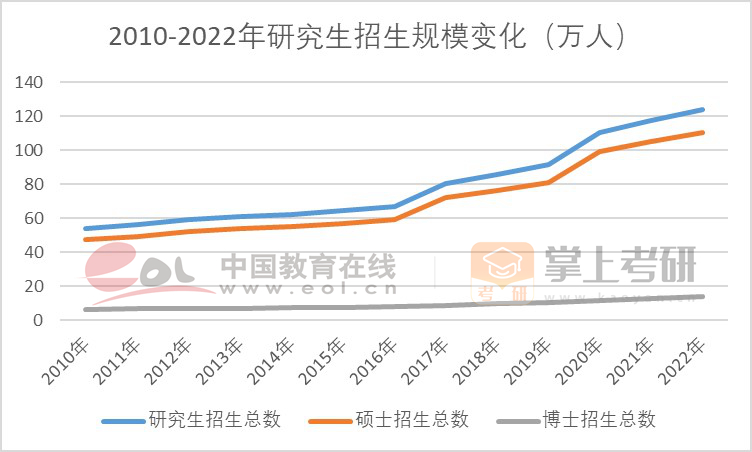 2022年全國教育事業(yè)發(fā)展統(tǒng)計公報披露,全年研究生招生124.25萬人,比上年增加6.60萬人,增長5.61%;其中,博士生13.90萬人,碩士生共招收110.35萬人,碩士研究生招生量約占總量的89%。