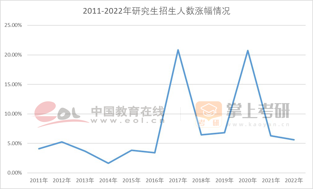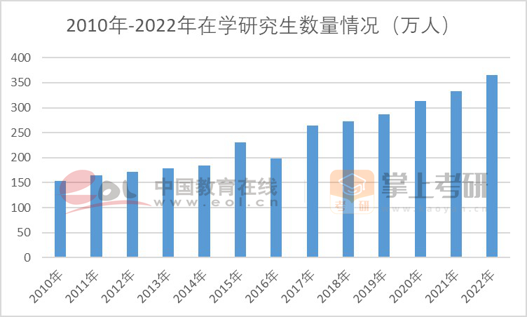 根據(jù)最新數(shù)據(jù),2022年全國共有在學(xué)研究生365.36萬人,比上年增加32.12萬人,增長率為9.64%,相較去年,增幅有所放緩。