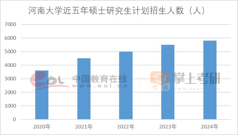 河南大學(xué)近五年碩士研究生招生計劃持續(xù)增長。由2020年的3600人,增長到2024年的5800人,五年間碩士研究生招生數(shù)量增長2200人。2024年學(xué)校招生計劃增幅為5.5%,低于去年的10%。