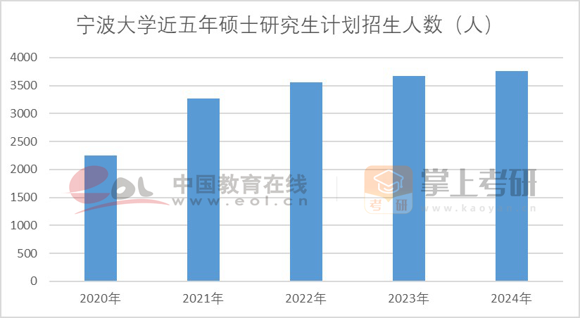 寧波大學(xué)近五年碩士研究生招生計劃持續(xù)增長。由2020年的2248人,增長到2024年的3757人,五年間碩士研究生招生數(shù)量增長1509人。2024年學(xué)校招生計劃增幅為2.45%,低于去年的2.92%。