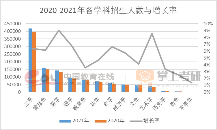 2021年研究生招生總量較上一年增長6.32%。從各學(xué)科增長率方面看,醫(yī)學(xué)是增長率最高的學(xué)科,達(dá)到了9.03%,引領(lǐng)了增長高點(diǎn);其次是藝術(shù)學(xué),招生人數(shù)增長率達(dá)到了8.55%。