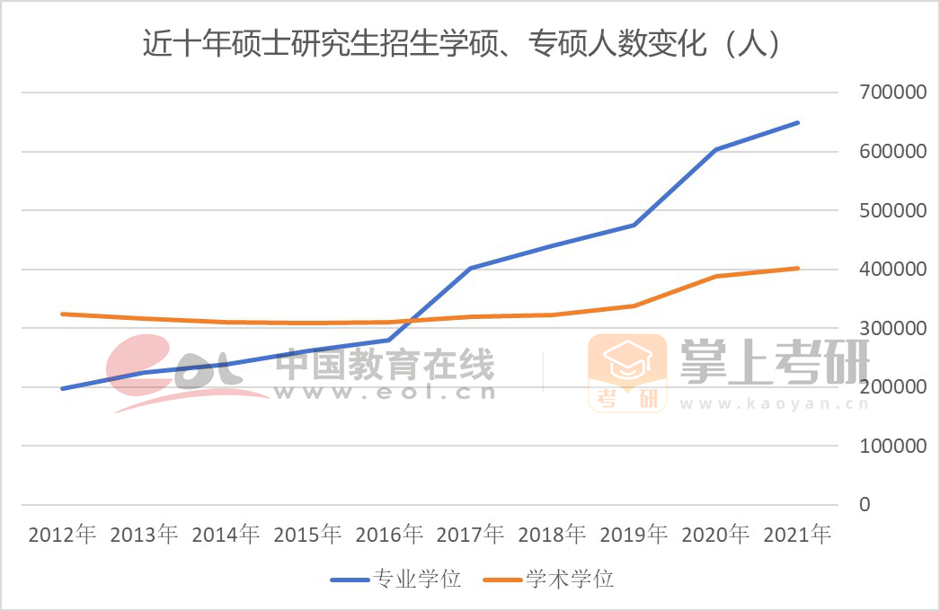 在研究生招生總?cè)藬?shù)中,專碩招生人數(shù)增長明顯。從2012年的19.7萬增長到2021年的64.9萬,專碩招生人數(shù)增長3倍多。