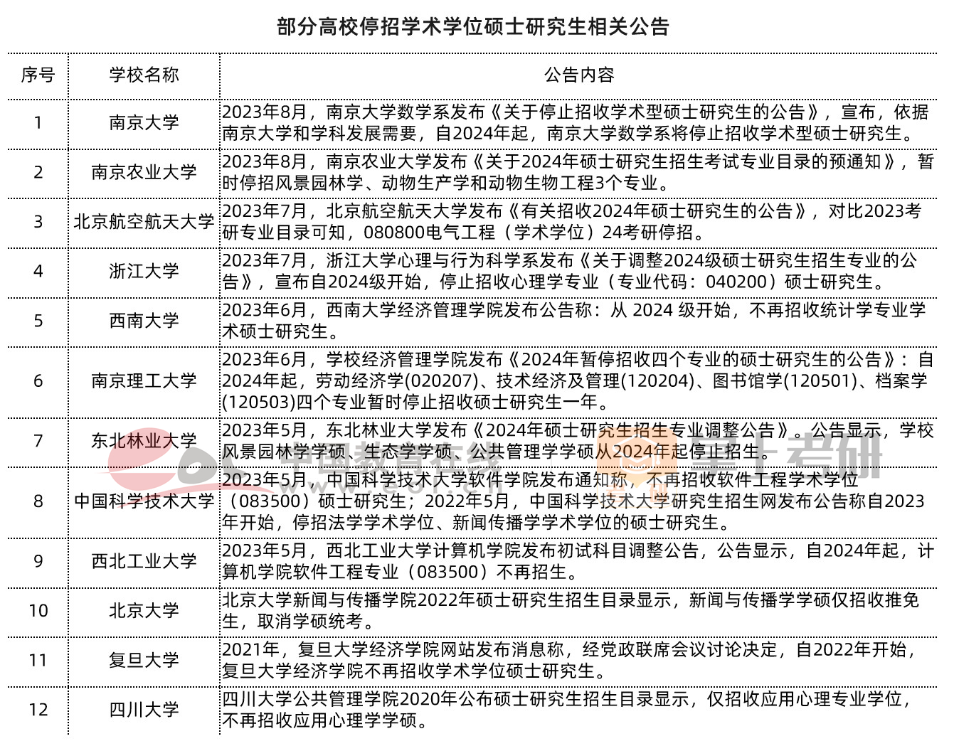 2023年6月,西南大學(xué)經(jīng)濟(jì)管理學(xué)院發(fā)布公告稱:從 2024 級開始,不再招收統(tǒng)計學(xué)專業(yè)學(xué)術(shù)碩士研究生。此外,中國科學(xué)技術(shù)大學(xué)和西北工業(yè)大學(xué)也宣布,不再招收軟件工程學(xué)術(shù)學(xué)位碩士研究生。東北林業(yè)大學(xué)的風(fēng)景園林學(xué)、公共管理學(xué)兩個學(xué)碩專業(yè)也從2024年起停止招生。