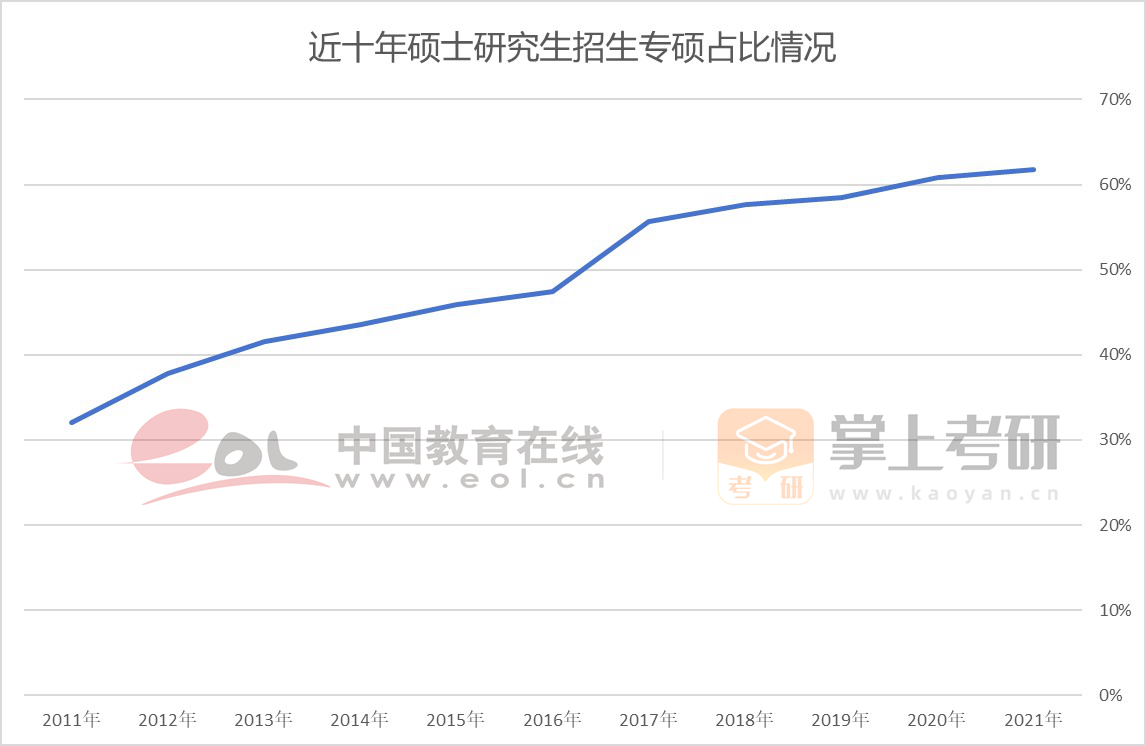 近十年碩士研究生招生中,專碩占比逐年提升,2021年占比將近62%,遠(yuǎn)超學(xué)碩。
