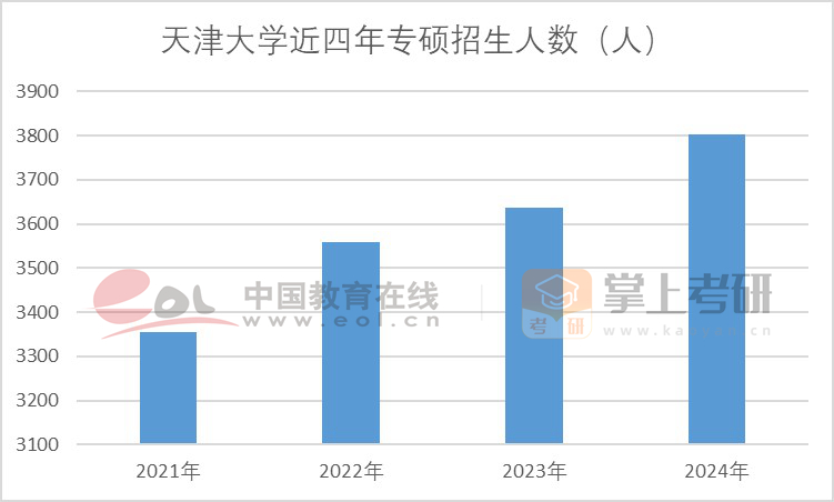 天津大學(xué)近四年來招收專業(yè)碩士人數(shù)逐年增加。從2021年招收專碩3355人,到2024年招收專碩3804人,四年間擴(kuò)招專業(yè)碩士449人。