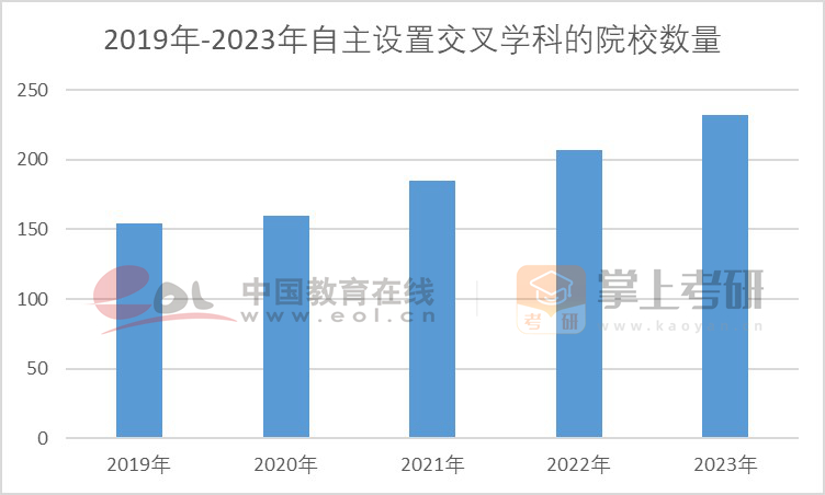 2023年我國自主設(shè)置交叉學(xué)科的院校數(shù)量為232個,相較于2022年的院校數(shù)量增加25個。從2019年到2023年,5年間我國自主設(shè)置交叉學(xué)科的院校數(shù)量增加了78個。