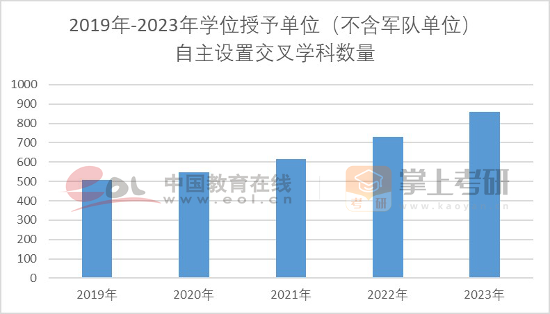 在數(shù)量方面,2023年我國學(xué)位授予單位(不含軍隊單位)自主設(shè)置交叉學(xué)科數(shù)量為860個,較2022年同比增長15.2%,2022年學(xué)位授予單位(不含軍隊單位)自主設(shè)置交叉學(xué)科數(shù)量為729個,較2021年增幅達(dá)到15.5%。2019年到2023年,5年間我國學(xué)位授予單位(不含軍隊單位)自主設(shè)置交叉學(xué)科數(shù)量增幅為40.9%。