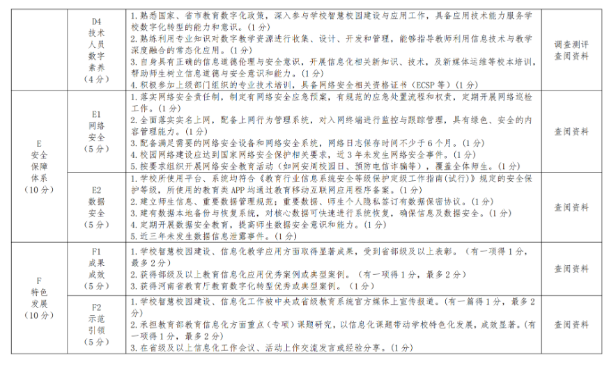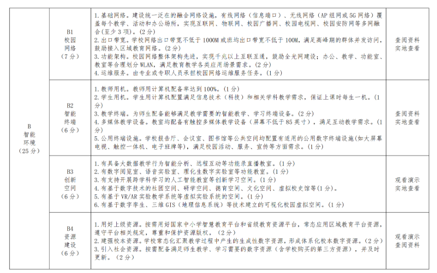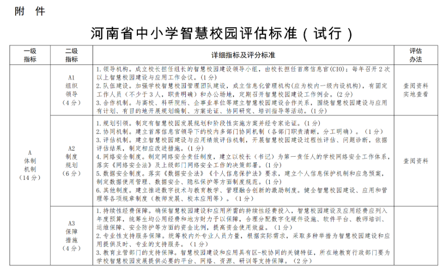 日前,河南省教育廳印發(fā)《河南省中小學智慧校園評估標準(試行)》,明確6大項一級指標和21項二級指標,評估辦法主要包括查閱資料、實地查看、觀看演示、調查測評等多種形式。