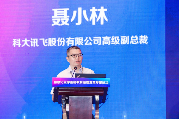 科大訊飛股份有限公司高級副總裁聶小林為論壇致辭并作主題為《人工智能助力教育治理現(xiàn)代化》的報告。聶小林總裁在致辭中表示,當(dāng)前教育信息化已經(jīng)進入數(shù)字化轉(zhuǎn)型的重要時期,教育治理面臨著重要挑戰(zhàn)。聶小林總裁從構(gòu)建以學(xué)生為中心的系統(tǒng)性創(chuàng)新體系、打造人工智能助推區(qū)域信息化教育治理應(yīng)用案例等方面介紹了科大訊飛的信息化教育治理實踐。