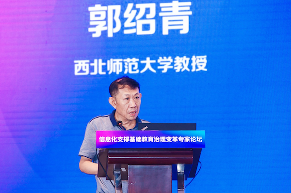 在論壇最后,西北師范大學(xué)郭紹青教授以《數(shù)字政府背景下的教育數(shù)字化治理》為主題作了總結(jié)報告。他以《國務(wù)院關(guān)于加強數(shù)字政府建設(shè)的指導(dǎo)意見》為背景,從數(shù)字經(jīng)濟與數(shù)字政府、教育數(shù)字治理本質(zhì)屬性和教育數(shù)字治理的遞進階段特征這三個方面展開報告。他談到十九大以來國家就開始強調(diào)數(shù)字經(jīng)濟創(chuàng)新發(fā)展,這也引發(fā)了教育方面的數(shù)字化創(chuàng)新發(fā)展。教育數(shù)字治理的本質(zhì)是數(shù)據(jù)的獲取、分析與應(yīng)用。教育數(shù)字治理的發(fā)展分為三個階段,第一個階段是優(yōu)化,第二個階段是重組,第三個階段是創(chuàng)新。