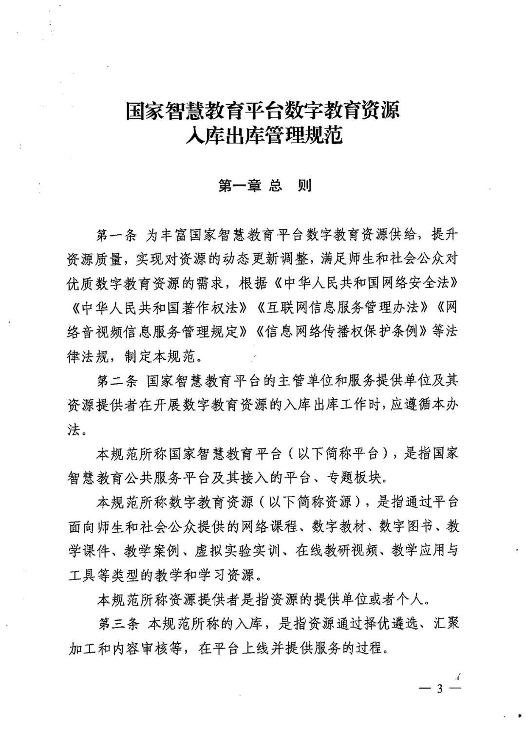 近日,為加快推進(jìn)國(guó)家教育數(shù)字化戰(zhàn)略行動(dòng),保障數(shù)字教育資源入庫(kù)出庫(kù),教育部辦公廳印發(fā)《國(guó)家智慧教育平臺(tái)數(shù)字教育資源入庫(kù)出庫(kù)管理規(guī)范》(簡(jiǎn)稱《規(guī)范》)。
