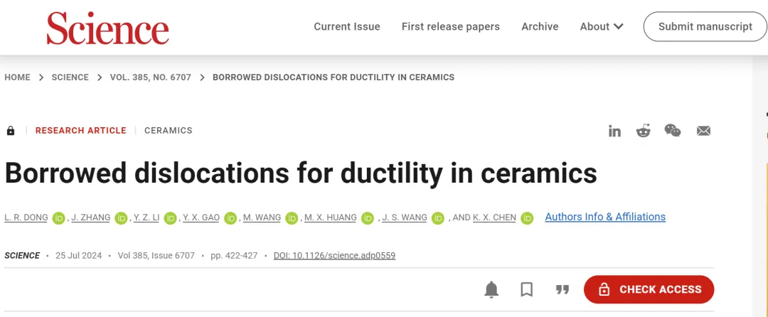 2024年7月26日,國(guó)際頂級(jí)期刊《科學(xué)》(Science)刊發(fā)了北京科技大學(xué)新金屬材料國(guó)家重點(diǎn)實(shí)驗(yàn)室陳克新研究員團(tuán)隊(duì)聯(lián)合北京工業(yè)大學(xué)王金淑教授團(tuán)隊(duì)以及香港大學(xué)黃明欣教授的最新科研成果《借位錯(cuò)實(shí)現(xiàn)陶瓷拉伸塑性變形》(Borrowed dislocations for ductility in ceramics)。該項(xiàng)研究成果在世界上首次實(shí)現(xiàn)陶瓷的室溫大變形拉伸塑性,標(biāo)志著學(xué)校在結(jié)構(gòu)陶瓷領(lǐng)域取得重要進(jìn)展,北京科技大學(xué)為該論文的第一通訊作者單位。
