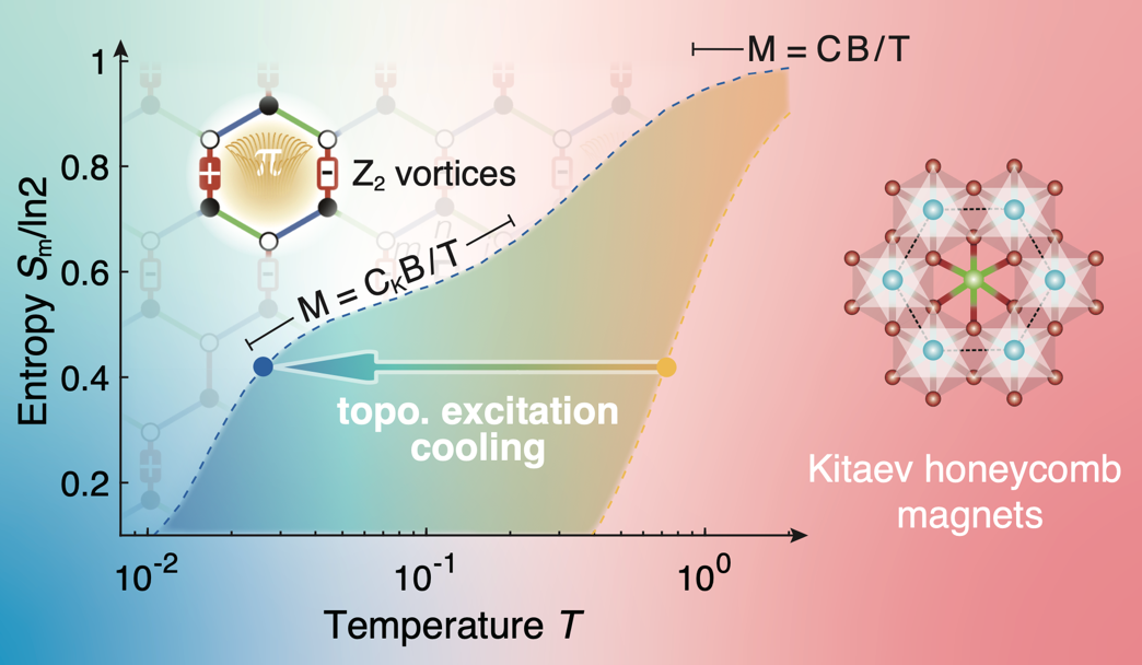 阻挫量子磁體通常具備較高的磁性離子密度、強(qiáng)烈的自旋漲落以及磁激發(fā)帶來的增強(qiáng)熱導(dǎo)等,并且材料結(jié)構(gòu)穩(wěn)定,可作為新型的磁制冷工質(zhì),有望實(shí)現(xiàn)極低溫的固態(tài)制冷。吉塔耶夫量子自旋液體由于阻挫效應(yīng)與量子漲落的共同作用,即便在遠(yuǎn)低于相互作用能標(biāo)的低溫甚至零溫時(shí)也不會(huì)形成磁有序,其低能拓?fù)浼ぐl(fā)會(huì)攜帶巨大的低溫熵,通過外場的有效調(diào)控能夠?qū)崿F(xiàn)顯著的磁卡效應(yīng),進(jìn)而實(shí)現(xiàn)拓?fù)浼ぐl(fā)極低溫制冷,這為探索新型固態(tài)制冷機(jī)制開辟了一條新途徑。