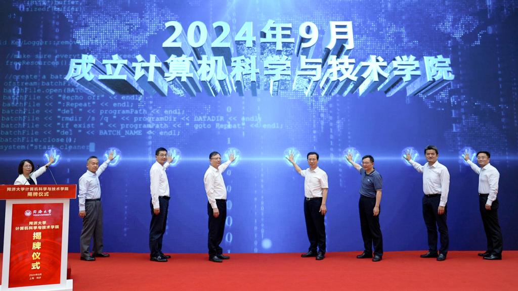 同濟(jì)大學(xué)黨委書記方守恩,校長(zhǎng)、中國工程院院士鄭慶華,上海市教衛(wèi)工作黨委副書記、上海市教育委員會(huì)副主任顧紅亮,上海市科學(xué)技術(shù)委員會(huì)副局長(zhǎng)級(jí)干部謝文瀾,上海市經(jīng)濟(jì)和信息化委員會(huì)二級(jí)巡視員劉益平,上海市嘉定區(qū)副區(qū)長(zhǎng)魏曉棟,以及同濟(jì)大學(xué)計(jì)算機(jī)科學(xué)與技術(shù)學(xué)院黨委書記熊嵐、院長(zhǎng)申恒濤共同揭牌。