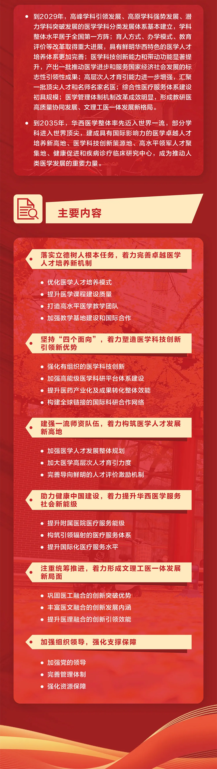 會議明確了加快推動華西醫(yī)學整體率先邁入世界一流的總體要求,強調(diào)要錨定一流目標,以服務(wù)國家戰(zhàn)略為導向,以高質(zhì)量發(fā)展為內(nèi)核,以學科建設(shè)為牽引,以全面深化改革為動力,推動華西醫(yī)學高質(zhì)量發(fā)展。到2029年,形成教研醫(yī)高質(zhì)量協(xié)同發(fā)展、文理工醫(yī)一體發(fā)展新格局,華西醫(yī)學整體水平居于全國第一方陣;到2035年,華西醫(yī)學整體率先邁入世界一流,成為推動人類醫(yī)學發(fā)展的重要力量,為以中國式現(xiàn)代化全面推進中華民族偉大復興作出川大新的貢獻。