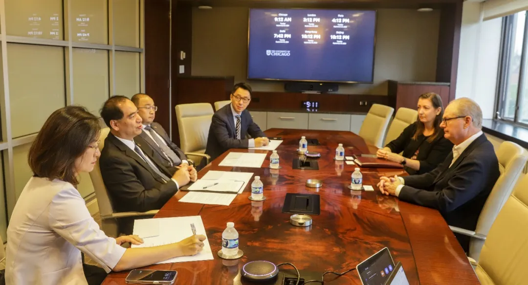 訪問芝加哥大學(xué)期間,芝加哥大學(xué)校長保羅·阿利維薩托斯(Paul Alivisatos)會見代表團(tuán)一行。龔旗煌感謝芝加哥大學(xué)對2024年中美頂尖大學(xué)“10+10”校長論壇給予的鼎力支持,并回顧了兩校在教學(xué)科研、人才培養(yǎng)等領(lǐng)域的密切合作。龔旗煌表示,芝加哥大學(xué)北京中心及北京大學(xué)芝加哥中心在促進(jìn)兩校深度合作方面具有標(biāo)志性意義,希望未來兩校在學(xué)生聯(lián)合培養(yǎng)、科學(xué)研究等領(lǐng)域開展更加廣泛的合作。阿利維薩托斯歡迎龔旗煌一行訪問芝加哥大學(xué),并介紹了芝加哥大學(xué)海外中心在人才培養(yǎng)領(lǐng)域發(fā)揮的重要作用。他希望在已有合作基礎(chǔ)上,進(jìn)一步深化兩校合作。