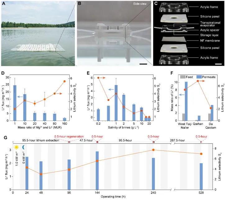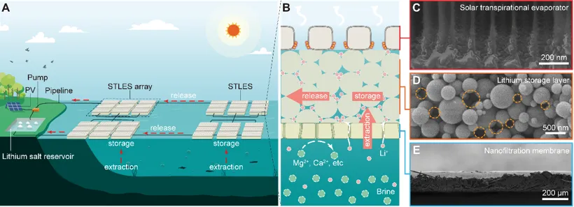 南京大學(xué)朱嘉教授、陳駿院士與合作者在鹽湖鋰資源綠色開發(fā)領(lǐng)域取得重要突破。該工作通過仿生鹽土植物的“選擇性吸收-儲(chǔ)存-釋放”機(jī)制,成功開發(fā)界面光熱鹽湖提鋰技術(shù)。該技術(shù)利用界面光熱蒸騰效應(yīng),強(qiáng)化納米通道傳質(zhì)并驅(qū)動(dòng)高精度離子分離,實(shí)現(xiàn)了高選擇性、低能耗、低碳排放的太陽能鹽湖提鋰。這一技術(shù)有望推動(dòng)我國青藏鹽湖鋰資源的綠色開發(fā),減少對進(jìn)口鋰礦的依賴,保障戰(zhàn)略性關(guān)鍵金屬鋰的安全供給。相關(guān)研究成果以“Solar transpiration-powered lithium extraction and storage”為題,于2024年9月27日發(fā)表于Science期刊。