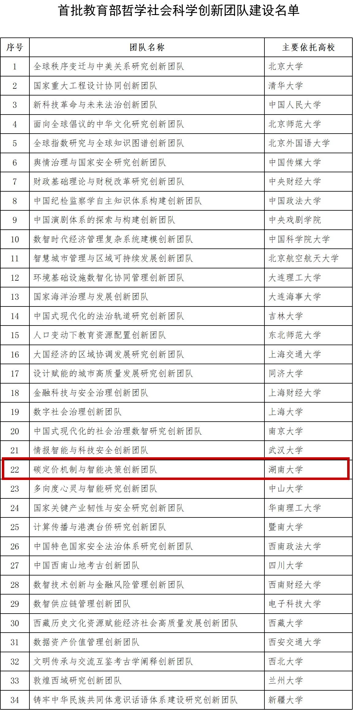 教育部哲學社會科學創(chuàng)新團隊建設是貫徹落實習近平總書記關于哲學社會科學的重要論述和在全國教育大會上的重要講話精神的重要舉措,是服務國家重大戰(zhàn)略需求、推動教育領域建構中國自主知識體系的工作抓手。根據(jù)《教育部哲學社會科學創(chuàng)新團隊支持辦法(試行)》,經(jīng)過組織申報、資格審核、會議評審、答辯評審等環(huán)節(jié),教育部研究確定北京大學、清華大學、中國人民大學、湖南大學等34個創(chuàng)新團隊為首批教育部哲學社會科學創(chuàng)新團隊。