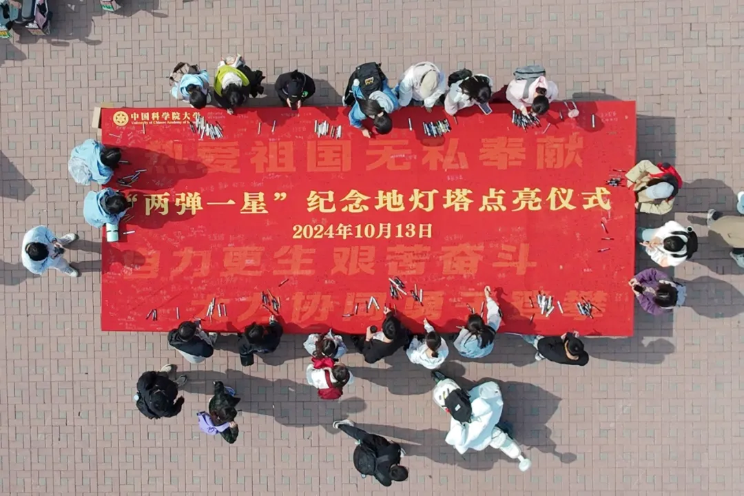 10月13日晚,國科大在雁棲湖校區(qū)舉行“兩彈一星”紀(jì)念地?zé)羲c(diǎn)亮儀式。