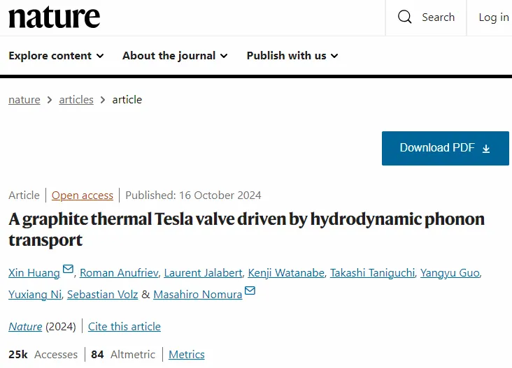 近日,國(guó)際頂級(jí)學(xué)術(shù)期刊Nature刊發(fā)西南交通大學(xué)物理科學(xué)與技術(shù)學(xué)院倪宇翔教授參與完成的科研成果“A graphite thermal Tesla valve driven by hydrodynamic phonon transport”。該成果是物理、材料等多學(xué)科的深度交叉融合,由倪宇翔教授、日本東京大學(xué)Masahiro Nomura教授團(tuán)隊(duì)、哈爾濱工業(yè)大學(xué)郭洋裕教授等合作完成。