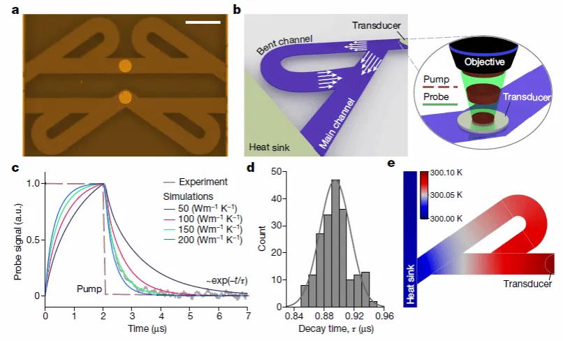 特斯拉閥門在微流體系統(tǒng)中對(duì)流體流動(dòng)的整流作用顯著,它啟發(fā)了研究者們參照液態(tài)環(huán)境中的流體整流機(jī)制,設(shè)計(jì)出現(xiàn)代固態(tài)電子和熱整流器件。與微流體通道中的流體整流不同,微固體通道中的熱聲子整流更為復(fù)雜,原因在于聲子之間缺乏動(dòng)量守恒的碰撞,同時(shí)類似液態(tài)的聲子流動(dòng)發(fā)生的頻率不高。該工作通過聲子流體動(dòng)力學(xué)的方法,在同位素富集的石墨晶體中實(shí)現(xiàn)了熱傳導(dǎo)的整流。研究人員在90納米厚的石墨中設(shè)計(jì)了一個(gè)微米級(jí)的特斯拉閥門,實(shí)驗(yàn)觀察到在45K時(shí),熱導(dǎo)率在相反方向上有15.2%的明顯差異。這項(xiàng)研究是利用集體聲子行為進(jìn)行微電子設(shè)備熱管理的重要進(jìn)展,為固態(tài)材料中的熱整流技術(shù)的發(fā)展奠定了基礎(chǔ)。