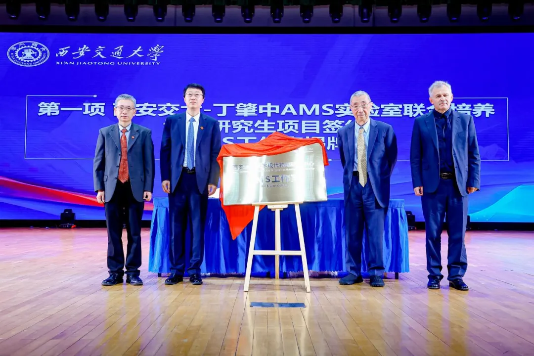 此外,丁肇中與張立群共同簽署了西安交大-丁肇中AMS實驗室聯(lián)合培養(yǎng)博士研究生項目合作協(xié)議。丁肇中、張立群、維塔利、西安交通大學物理學院院長高宏共同為西安交通大學現(xiàn)代物理研究中心AMS工作室揭牌。