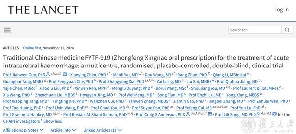 在這項題為“Traditional Chinese medicine FYTF-919 (Zhongfeng Xingnao oral prescription) for the treatment of acute intracerebral haemorrhage: a multicentre, randomised, placebo-controlled, double-blind, clinical trial”(《中醫(yī)藥FYTF919治療急性腦出血:一項多中心隨機(jī)、安慰劑對照的雙盲臨床研究》)的研究中,研究人員發(fā)現(xiàn),“中風(fēng)醒腦方”在整體上未對急性腦出血患者的臨床預(yù)后產(chǎn)生顯著改善,但在特定群體——皮層出血和中等以上出血患者中,顯示出潛在效果(有待進(jìn)一步驗證)。