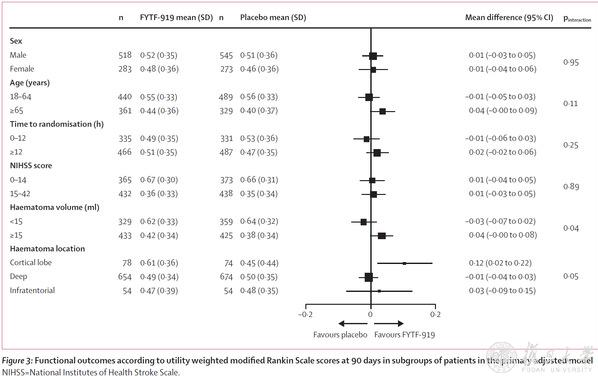 研究結(jié)果顯示,試驗組和安慰劑組在90天UW-mRS的平均值上所差無幾,各項敏感性分析結(jié)果均一致,在亞組分析上,治療效果在血腫體積和血腫位置方面展現(xiàn)出了顯著異質(zhì)性。