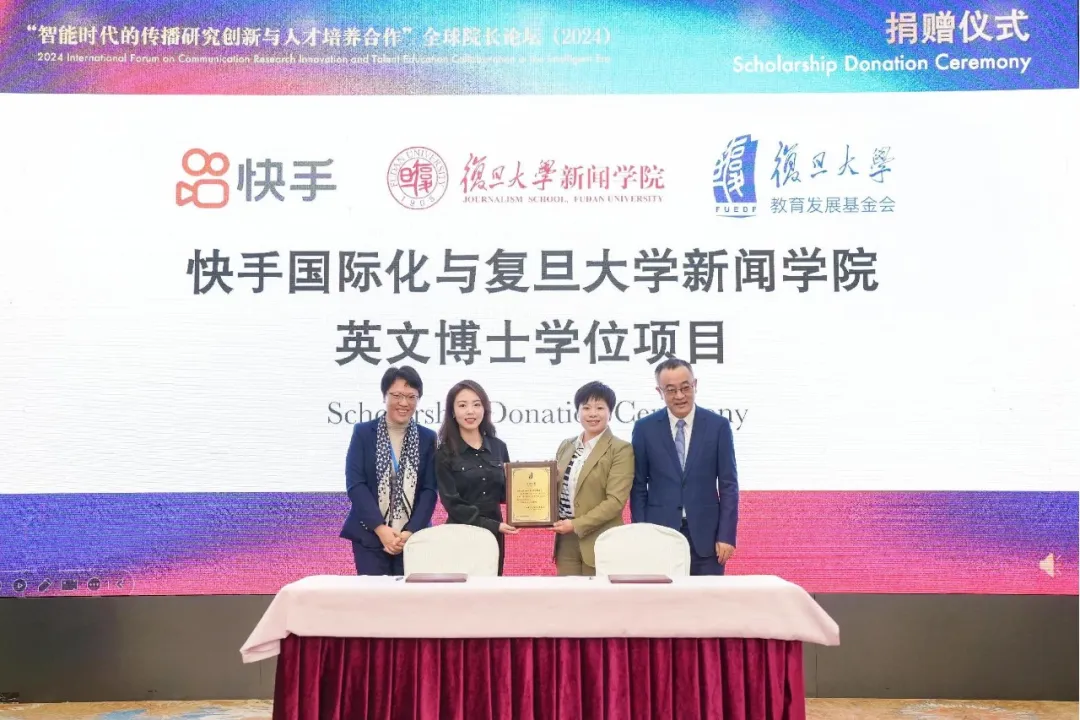 11月24日,由復(fù)旦大學(xué)新聞學(xué)院主辦的“智能時代的傳播研究創(chuàng)新與人才培養(yǎng)合作”全球院長論壇在復(fù)旦大學(xué)召開。論壇開幕式上舉行了快手國際化——復(fù)旦大學(xué)新聞學(xué)院英文博士項目獎學(xué)金捐贈儀式。復(fù)旦大學(xué)對外聯(lián)絡(luò)與發(fā)展處副處長、上海復(fù)旦大學(xué)教育發(fā)展基金會副秘書長林晶晶向快手國際化事業(yè)部人力資源高級總監(jiān)徐康楠頒發(fā)捐贈牌。