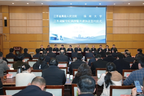 12月9日下午,揚(yáng)州大學(xué)舉行江蘇調(diào)解學(xué)院揭牌暨共建協(xié)議簽約儀式?;顒?dòng)現(xiàn)場(chǎng),江蘇省高級(jí)人民法院黨組書記、院長(zhǎng)夏道虎,揚(yáng)州大學(xué)黨委書記焦新安共同為“江蘇調(diào)解學(xué)院”揭牌。江蘇省高院與揚(yáng)州大學(xué)共同簽訂《共建江蘇調(diào)解學(xué)院合作框架協(xié)議》,揚(yáng)州中院與揚(yáng)州大學(xué)共同簽訂《全面合作協(xié)議》。