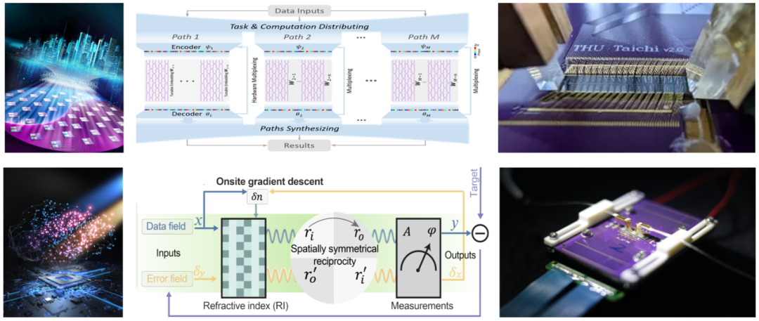 針對人工智能算力與能效的雙重桎梏,首創(chuàng)了分布式廣度光計算架構(gòu),研制了國際首款大規(guī)模通用智能光計算芯片“太極-I”,實現(xiàn)160 TOPS/W的系統(tǒng)級能效,發(fā)表于《科學》。針對大規(guī)模神經(jīng)網(wǎng)絡訓練難題,提出了全前向智能光計算訓練架構(gòu),研制了通用光訓練芯片“太極-II”,支撐智能系統(tǒng)的高效精準光訓練,發(fā)表于《自然》。太極-I和-II分別實現(xiàn)了大規(guī)模智能光計算推理與訓練,構(gòu)成了智能計算的完整生命周期,將合力為AI大模型、智能無人系統(tǒng)等注入算力發(fā)展的“光”動力。