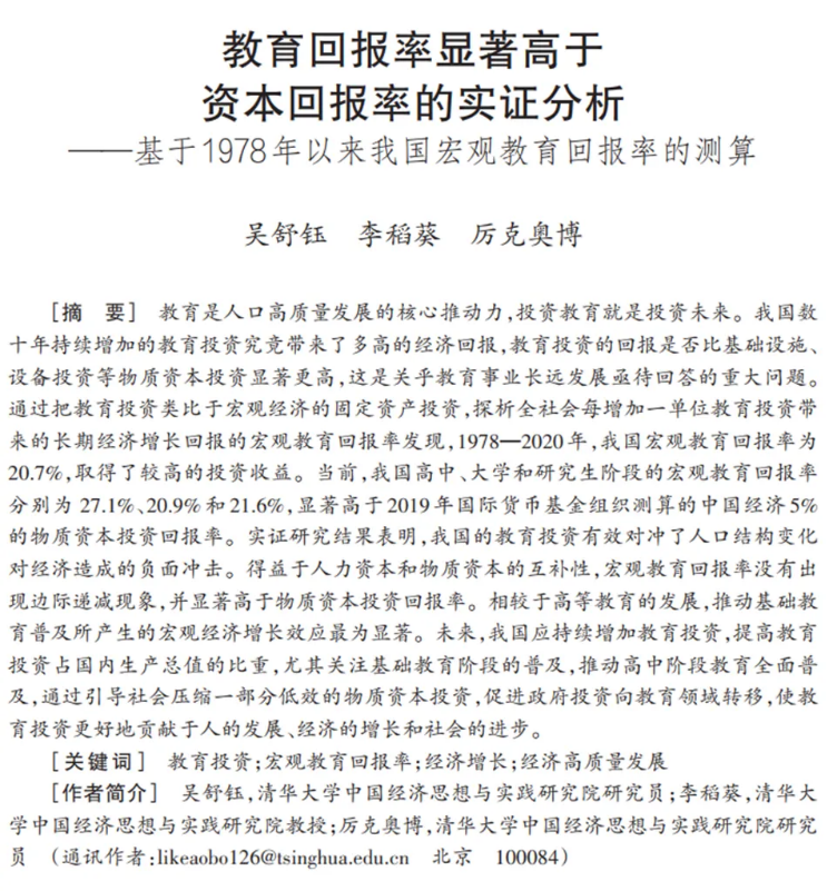 本研究回應了一個重大社會關切,即在基建投資基本飽和、物質(zhì)資本投資回報率不斷下滑的當下,我國政府的公共投資該往哪投的問題。文章通過創(chuàng)新的分析方法,測算了我國教育投資帶來的長期宏觀經(jīng)濟增長回報。研究發(fā)現(xiàn)我國各學段的宏觀教育回報率均超過20%,遠超當前5%左右的物質(zhì)資本回報率。實證結(jié)果表明我國應持續(xù)增加教育投資,引導社會壓縮一部分低效的物質(zhì)資本投資,促進政府投資向教育領域轉(zhuǎn)移,使教育投資更好地貢獻于人的發(fā)展、經(jīng)濟的增長和社會的進步。