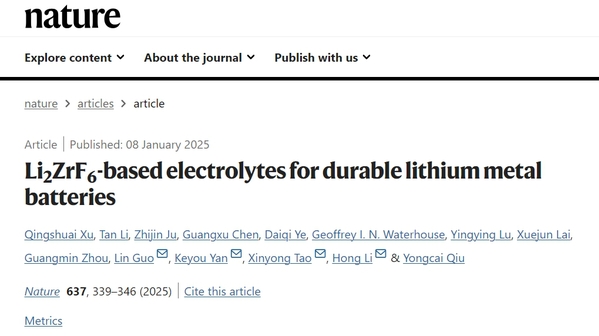 由于m-Li2ZrF6 納米顆粒的合成工藝簡(jiǎn)單,具備大規(guī)模生產(chǎn)條件,為鋰金屬電池的廣泛應(yīng)用提供了解決方案。研究成果歷經(jīng)2年5個(gè)月的4輪審稿、修改,最終以“Li2ZrF6 basedelectrolytes for durable lithium metal batteries”(六氟鋯酸鋰基耐用型鋰金屬電池)為題發(fā)表在國(guó)際頂尖學(xué)術(shù)期刊Nature上。