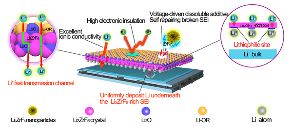 針對(duì)以上難點(diǎn),研究團(tuán)隊(duì)基于理論計(jì)算,驗(yàn)證了以t-Li2ZrF6晶體構(gòu)建理想型固態(tài)電解質(zhì)界面的可行性,首次提出用電場(chǎng)驅(qū)動(dòng)m-Li2ZrF6轉(zhuǎn)化為t-Li2ZrF6來構(gòu)筑固態(tài)電解質(zhì)界面的策略。相關(guān)實(shí)驗(yàn)表明,這一策略不僅能夠憑借優(yōu)異的電子絕緣性阻止電子擊穿固態(tài)電解質(zhì)界面進(jìn)而抑制電解液的分解,還能夠?yàn)長(zhǎng)i+ 提供快速遷移的通道,提高鋰金屬電池的倍率性能。此外,t-Li2ZrF6晶體表面豐富的親鋰位點(diǎn)能夠和其內(nèi)部的離子通道一起,誘導(dǎo)鋰金屬均勻沉積,抑制鋰枝晶的生長(zhǎng),從而提高鋰金屬電池的安全性。同時(shí),過量m-Li2ZrF6添加劑不僅能夠改善傳統(tǒng)添加劑在循環(huán)中被耗盡的缺陷,還能夠通過ZrF62-離子及時(shí)修復(fù)破損的固態(tài)電解質(zhì)界面,為鋰金屬負(fù)極的界面穩(wěn)定性提供長(zhǎng)期保護(hù)。