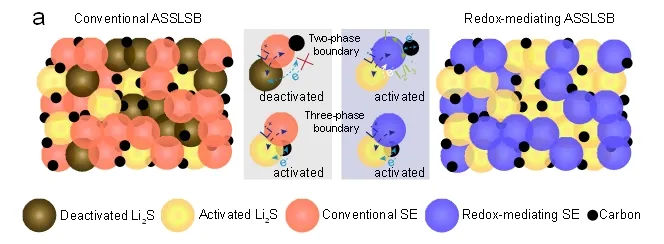圖1. 傳統(tǒng)全固態(tài)鋰硫電池的問題及本研究的快速固固硫轉(zhuǎn)化反應(yīng)機(jī)制。
