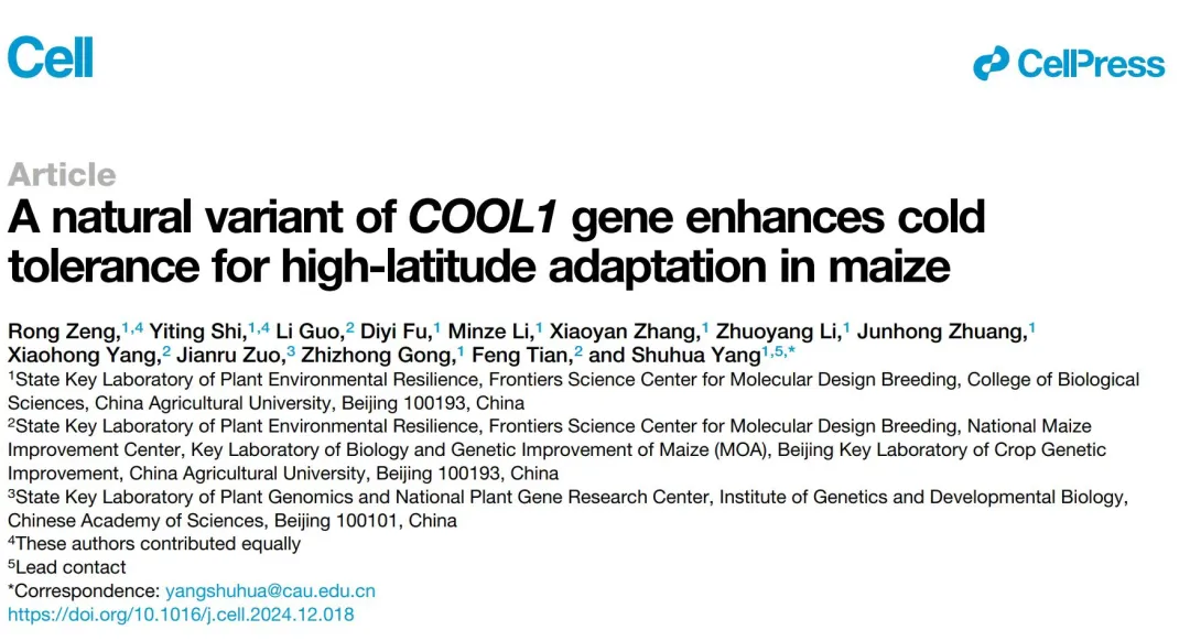 近日,中國農(nóng)業(yè)大學生物學院植物抗逆高效全國重點實驗室楊淑華課題組在Cell雜志在線發(fā)表了題為A natural variant of COOL1 gene enhances cold tolerance for high latitude adaptation in maize的研究論文。該研究首次揭示了玉米適應高緯度低溫環(huán)境的分子機制,發(fā)現(xiàn)玉米COOL1基因的自然變異通過增強低溫耐受性,促進其適應高緯度環(huán)境。這一發(fā)現(xiàn)彌補了關于玉米適應高緯度低溫環(huán)境的知識空白,并為高緯度地區(qū)玉米的種植提供了新的分子育種策略。
