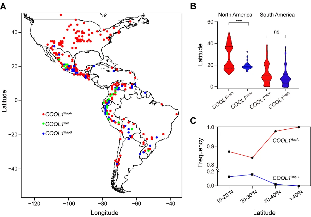 為了探究COOL1基因的進化起源,研究團隊對59種不同大芻草中COOL1啟動子區(qū)域進行了測序。結果顯示,超過一半的大芻草攜帶耐冷等位基因COOL1HapA,表明這一等位變異在野生種群體中就已存在。進一步對1,008份前哥倫布時期遍布美洲大陸的玉米地方品種進行基因分型,發(fā)現(xiàn)COOL1HapA耐冷等位基因主要分布于北部高緯度寒冷地區(qū),并在北美地區(qū)固定,而COOL1HapB冷敏感等位基因則更常見于低緯度溫暖地區(qū)。這表明,COOL1的耐冷等位基因在促進玉米適應高緯度低溫氣候過程中起到了重要作用(圖2)。研究還指出,我國一些主栽玉米品種(如先玉335、鄭單958等)的部分親本攜帶COOL1冷敏感等位基因。值得一提的是,在正常環(huán)境條件下,COOL1功能缺失突變體的產(chǎn)量相關性狀并未表現(xiàn)出顯著變化。因此,COOL1耐冷等位基因在提升玉米耐冷性、拓展其高緯度種植范圍方面具有顯著的應用潛力。