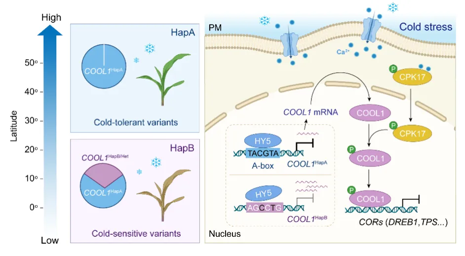 進一步研究發(fā)現(xiàn),COOL1啟動子區(qū)的4個顯著自然變異位點位于A-box基序,這一基序受光信號關鍵轉(zhuǎn)錄因子HY5的調(diào)控。在低溫環(huán)境下,HY5表達水平顯著上升,通過抑制COOL1基因的表達,正向調(diào)控玉米的耐冷性。COOL1啟動子的自然變異影響了HY5對其啟動子區(qū)的結合能力,從而導致了COOL1HapA和COOL1HapB耐冷性差異。進一步研究還表明,COOL1的蛋白穩(wěn)定性受到鈣依賴蛋白激酶CPK17的調(diào)控。低溫激活CPK17激酶活性,促使其從細胞質(zhì)進入細胞核,磷酸化COOL1,從而增強COOL1蛋白穩(wěn)定性,負向調(diào)控玉米的耐冷性。
