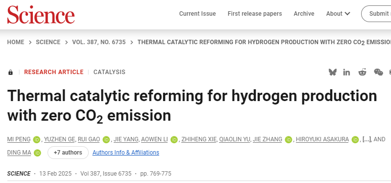 研究團隊在《Science》雜志發(fā)表的題為“Thermalcatalytic reforming for hydrogen production with zero CO2 emission”的研究成果則聚焦于乙醇和水分子重整的零碳排放制氫路徑。團隊開發(fā)了一種高效的Pt-Ir/α-MoC界面催化劑,不僅實現了水分子和乙醇分子的同時活化,還成功避免了乙醇分子C-C鍵的斷裂。這意味著,除了目標產物氫氣外,反應還能生成高附加值的乙酸,同時整個過程實現了零CO2排放。這一重大成果為零碳排放的工業(yè)制氫奠定了堅實的科學基礎。