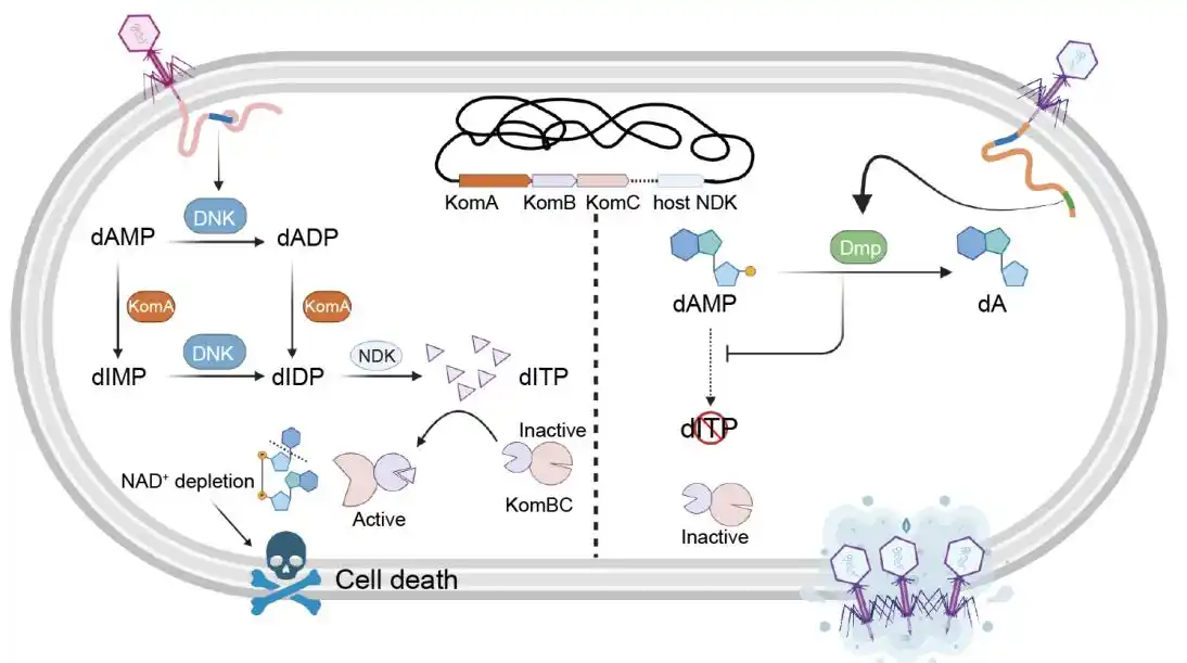 在微觀世界里,細(xì)菌與病毒之間每天都在上演著攻防大戰(zhàn)。生物體內(nèi)的信號傳遞如同精密的通信網(wǎng)絡(luò),而核苷酸分子長期被認(rèn)為是關(guān)鍵的“信號兵”。自1950年代發(fā)現(xiàn)環(huán)狀核苷酸(如cAMP、cGMP)以來,科學(xué)家已解析了其在代謝調(diào)節(jié)、免疫應(yīng)答中的核心作用,相關(guān)研究多次獲得諾貝爾獎。不同于環(huán)狀核苷酸的免疫作用,非典型核苷酸在過去普通被認(rèn)為不發(fā)揮任何生理作用。然而,研究團(tuán)隊通過基因分析,鎖定了一個由KomA(孔明A)、KomB(孔明B)、KomC(孔明C)三個蛋白組成的防御系統(tǒng)。當(dāng)噬菌體入侵時,其攜帶的脫氧核苷酸激酶(DNK)意外成為激活細(xì)菌免疫的“開關(guān)”:KomA與DNK協(xié)作,將核苷酸(dAMP)轉(zhuǎn)化為特殊信號分子dITP。這種分子能觸發(fā)KomC蛋白分解細(xì)胞內(nèi)的關(guān)鍵物質(zhì)NAD?,導(dǎo)致噬菌體因“能源枯竭”無法復(fù)制。令人稱奇的是,該系統(tǒng)巧妙利用入侵者攜帶的酶完成防御,正如三國時期諸葛亮“草船借箭”的智謀,因此被命名為“孔明系統(tǒng)”。這種堿基修飾核苷酸的信號傳導(dǎo)模式突破了環(huán)狀核苷酸作為信號分子的經(jīng)典理論體系,首次證實(shí)非典型核苷酸同樣具有免疫調(diào)控功能。