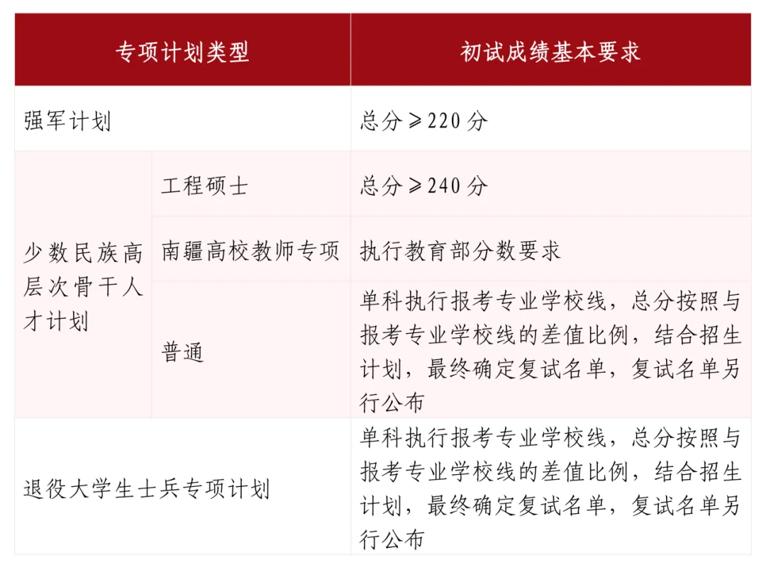 符合少數(shù)民族照顧政策(工作單位和戶籍在國務(wù)院公布的民族區(qū)域自治地方,且定向就業(yè)單位為原單位的少數(shù)民族在職人員)并已按規(guī)定申報的考生,按照教育部規(guī)定的初試成績要求進(jìn)入復(fù)試。