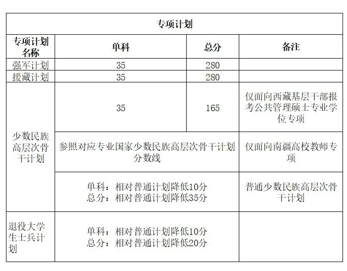 符合條件并申請(qǐng)享受少數(shù)民族照顧政策的考生(指工作單位和戶(hù)籍在國(guó)務(wù)院公布的民族區(qū)域自治地方,且定向就業(yè)單位為原單位的少數(shù)民族在職人員考生),總分相較報(bào)考專(zhuān)業(yè)普通計(jì)劃降10分,單科不變。