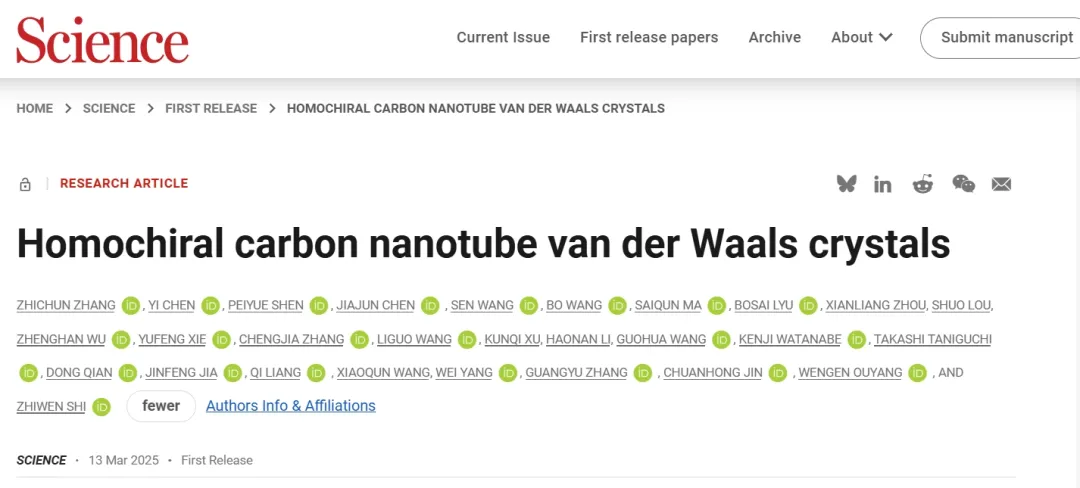近日,上海交通大學(xué)物理與天文學(xué)院史志文教授、梁齊教授與合作者在《Science》上發(fā)表題為“Homochiral carbon nanotube van der Waals crystals”的研究論文,論文以First Release的形式在Science網(wǎng)站提前在線發(fā)表。該研究開發(fā)了一種制備碳納米管陣列的全新方法,成功實(shí)現(xiàn)了單一手性平行密排碳納米管陣列的直接生長,首次得到了碳納米管范德華晶體結(jié)構(gòu),并演示了所制備的碳納米管陣列可用于制造高性能場效應(yīng)晶體管器件。