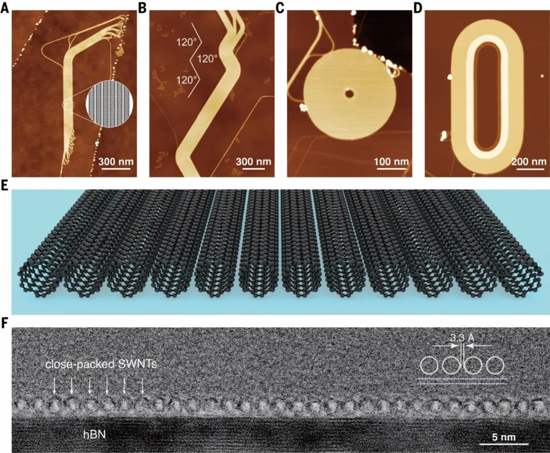 碳納米管陣列晶體是通過一種納米顆粒催化的化學(xué)氣相沉積(CVD)生長技術(shù)實(shí)現(xiàn)的。實(shí)驗(yàn)觀測發(fā)現(xiàn),生長得到的碳納米管陣列均由同一手性的碳納米管組成,碳納米管之間相互平行、緊密排列,間距為固定的0.33 nm。理論分析揭示,這種近乎完美的陣列結(jié)構(gòu)的形成源自于碳納米管與六方氮化硼基底之間的超潤滑摩擦特性及碳納米管間的范德華相互作用:生長出的碳納米管可以在基底上自由滑動(dòng),找到能量更低的構(gòu)型,反復(fù)折疊排列在一起,并最終自組裝形成范德華晶體結(jié)構(gòu)。