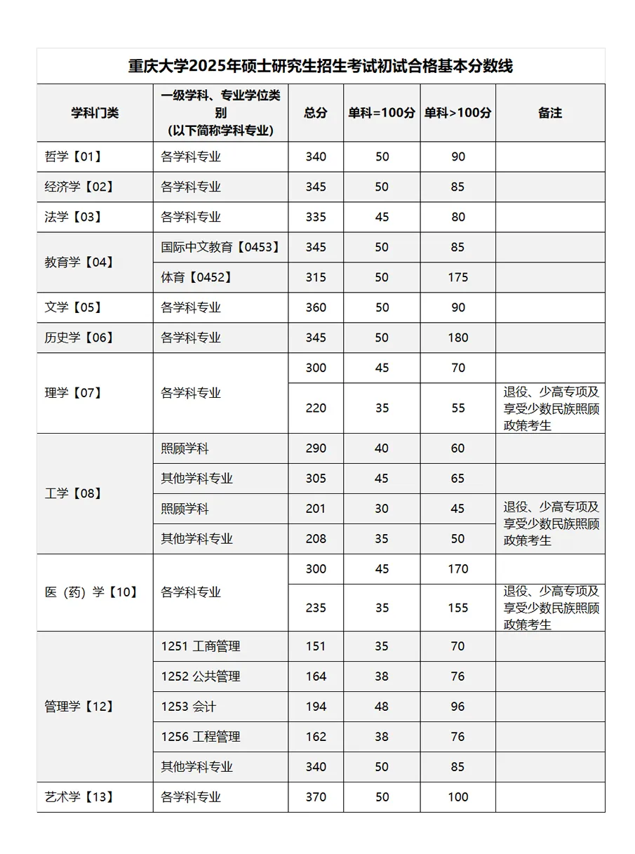 2.學(xué)校分?jǐn)?shù)線是考生初試合格的最低成績(jī)要求。學(xué)院可根據(jù)本單位學(xué)科(方向)特點(diǎn)、生源情況和招生計(jì)劃數(shù)確定不低于學(xué)校線的成績(jī)要求(二次劃線)。二次劃線將于2025年3月17日左右公布,請(qǐng)考生密切關(guān)注重慶大學(xué)研究生招生信息網(wǎng)。