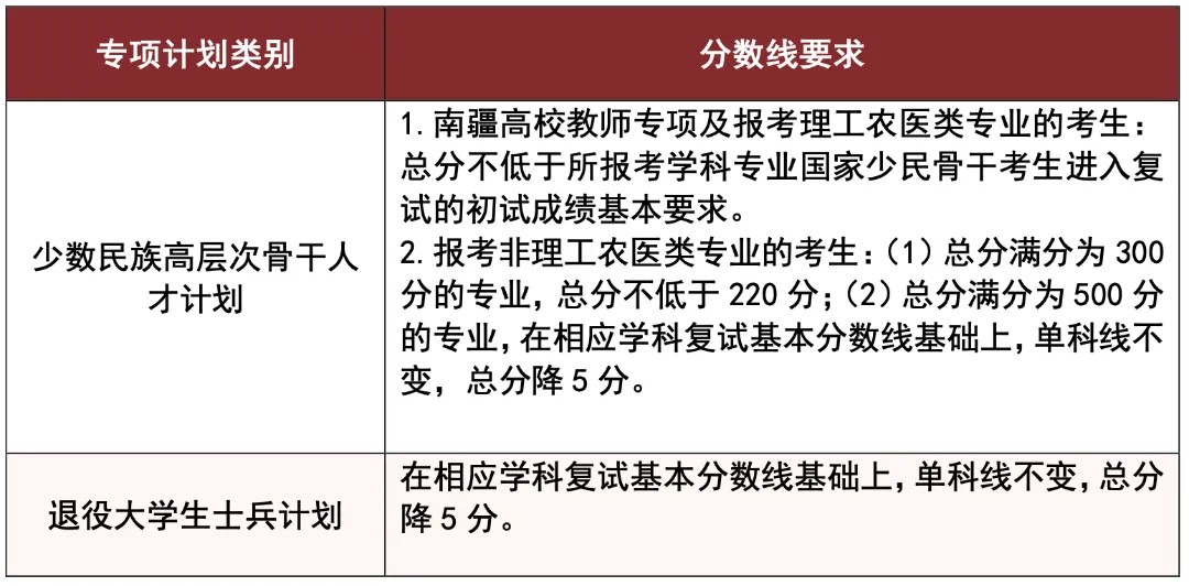 3.我校少數(shù)民族照顧政策按照教育部《2025年全國碩士研究生招生工作管理規(guī)定》執(zhí)行。工作單位在國務(wù)院公布的民族區(qū)域自治地方,且定向就業(yè)原單位的少數(shù)民族在職人員考生,申請享受照顧政策的,須在網(wǎng)上報(bào)名時(shí)按要求填報(bào)相關(guān)信息。未按規(guī)定申報(bào)或?qū)徍宋赐ㄟ^的,不享受照顧政策。學(xué)校將根據(jù)考生材料和有關(guān)部門反饋的名單進(jìn)行審核。審核通過者可在相應(yīng)普通計(jì)劃學(xué)科分?jǐn)?shù)線基礎(chǔ)上總分降5分或一門單科降5分,考生在享受照顧政策后,分?jǐn)?shù)不得低于享受少數(shù)民族照顧政策國家線有關(guān)要求。