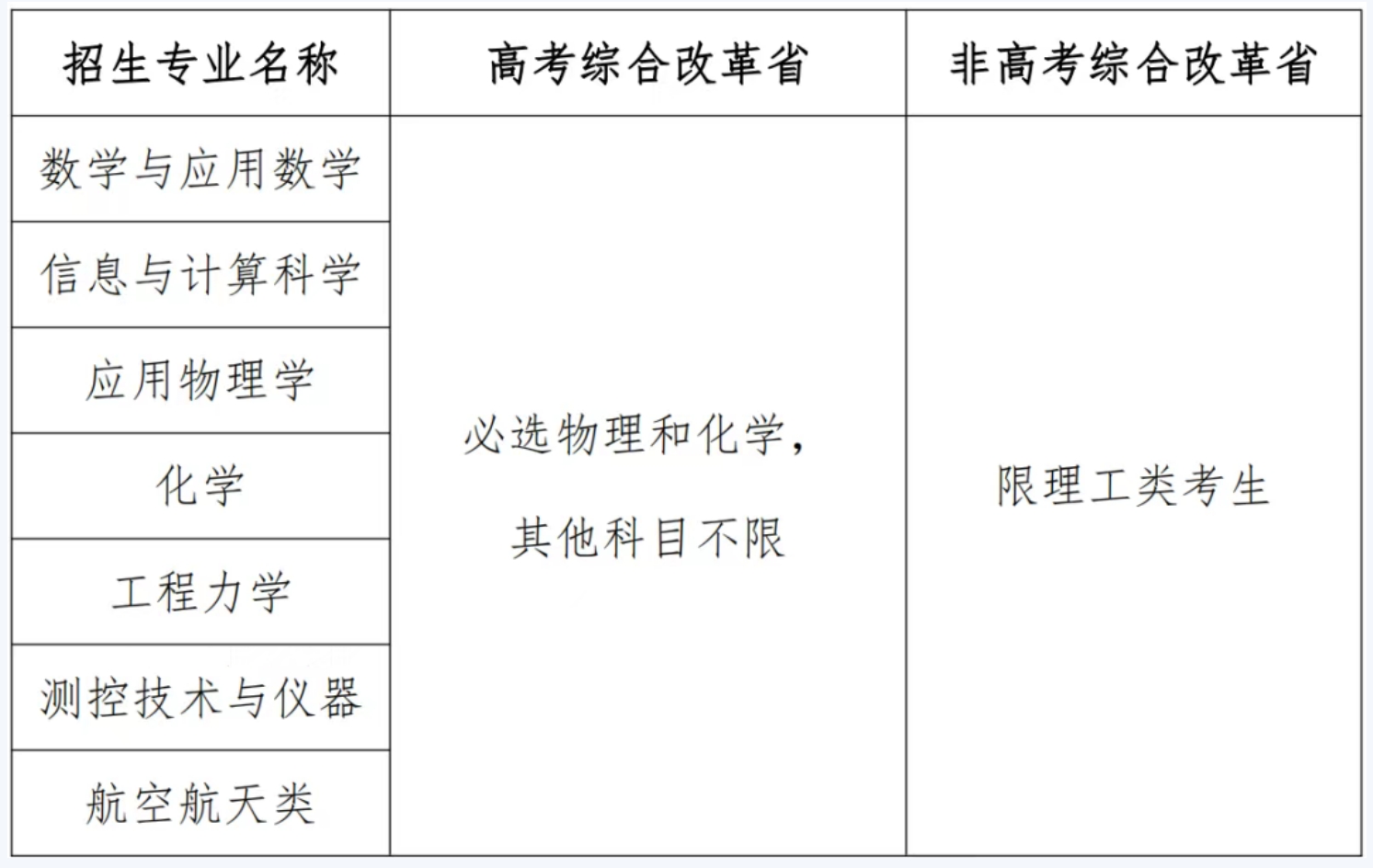 為全面貫徹全國(guó)教育大會(huì)精神,深入落實(shí)《國(guó)務(wù)院關(guān)于深化考試招生制度改革的實(shí)施意見》(國(guó)發(fā)〔2014〕35號(hào)),根據(jù)《關(guān)于在部分高校開展基礎(chǔ)學(xué)科招生改革試點(diǎn)工作的意見》(教學(xué)〔2020〕1號(hào))等文件,服務(wù)國(guó)家重大戰(zhàn)略需求,加強(qiáng)基礎(chǔ)學(xué)科拔尖創(chuàng)新人才選拔培養(yǎng),經(jīng)批準(zhǔn),我校自2020年起開展基礎(chǔ)學(xué)科招生改革試點(diǎn)工作(也稱“強(qiáng)基計(jì)劃”),探索多維度考核評(píng)價(jià)模式,選拔一批有志向、有興趣、有天賦的青年學(xué)生,培養(yǎng)具有空天報(bào)國(guó)情懷、扎實(shí)數(shù)理基礎(chǔ)、科學(xué)創(chuàng)新能力、全球視野格局的高素質(zhì)拔尖創(chuàng)新人才,為國(guó)家重大戰(zhàn)略領(lǐng)域輸送后備人才。